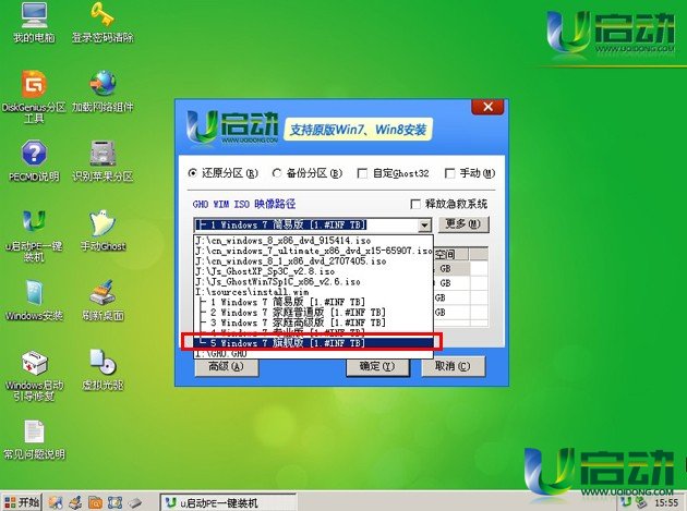 应用键盘上的方向键将光标移至“【02】应用u启动win2003PE加强版(装机推荐)”后按回车键确认,电脑便会启动进入win2003PE系统。双击桌面上的“u启动PE一键装机工具”,在弹出利用程序的窗口中选择放在u盘中的系统镜像文件以及系统的版本。如下图所示:
