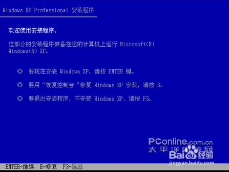 从光驱启动系统后,就会看到如图3所示的Windows XP安装欢迎页面。根据屏幕提示,按下Enter键来持续进入下一步安装过程。