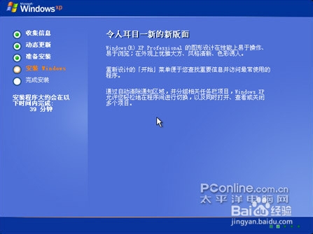 Windows XP采用的是图形化的安装方法,在安装页面中,左侧标识了正在进行的内容,右侧则是用文字列举着相对于以前版本来说WindowsXP所具有的新特征。(如图1所示)