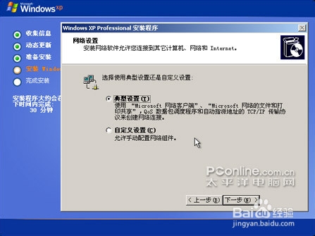网络是XP系统的一个重要组成部分,也是目前生活所离不开的。在安装过程中就需要对网络进行相干的设置(如图8所示)。如果你是通过ADSL等常见的方法上网的话,选择“范例设置”即可。