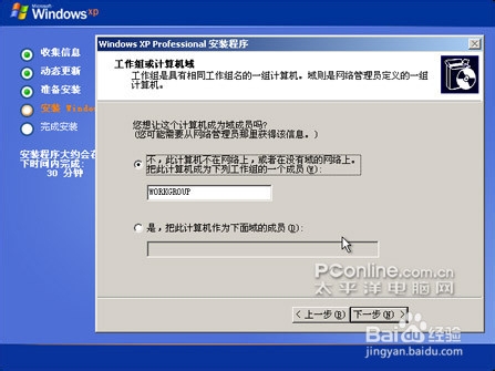 在网络设置部分还需要选择盘算机的工作组或者盘算机域(如图9所示)。对于普通的家庭用户来说,在这一步直接点击“下一步”就可以了。