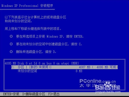 现在进入本质性的XP安装过程了(如图5所示)。新买的硬盘还没有进行分区,所以首先要进行分区。按“C”键进入硬盘分区划分的页面。如果硬盘已经分好区的话,那就不用再进行分区了。
