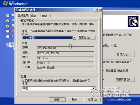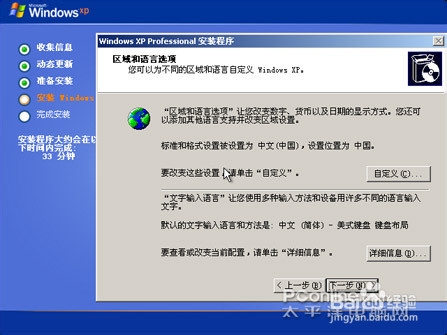 WindowsXP支撑多区域以及多语言,所以在安装过程中,第一个需要设置就是区域以及语言选项了。如果没有特别需要的话,这一步直接按“下一步”即可。