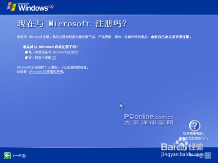 在这里可以选择要不要在Microsoft上注册(如图7所示),这里的注册并不是Windows XP的激活,所以是否注册都无关紧要。