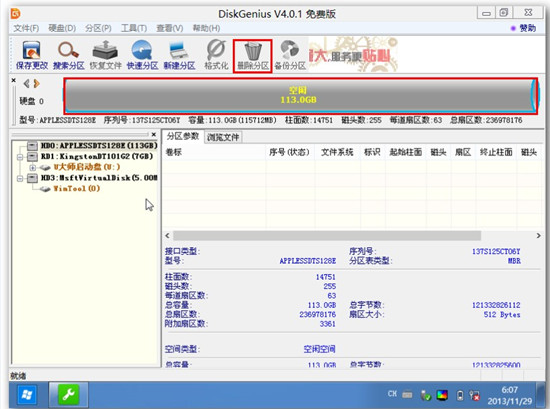 在弹出的窗口中你会创造工具栏中的“删除分区”图标为灰色,这时先选中一个硬盘分区然后会看到“删除分区”图标变亮了然后单击它;按照这个方法依次将所有分区都删除掉,如图会创造“删除图标”会再次变灰。
