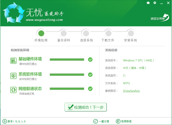 二,软件主动检测电脑软硬件环境以及电脑网络连通状态,完成后点击下一步按钮。