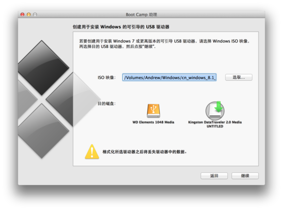 6、在下方选择你的U盘。如果你同时插着其他的USB驱动器(如:移动硬盘),此处必定警惕选择,否则稍后移动硬盘被格式化掉就得不偿失了。选择好后点击持续。