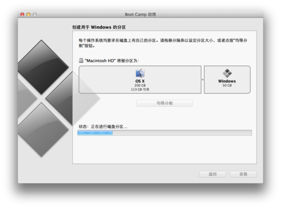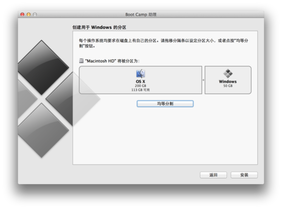 9、安装盘制作完成后我们就来到了分区界面。拖动中间的小圆点来调节OS X与Windows分区的大小,或直接点击均等分割来平分两个分区。