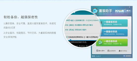 虽说,重装系统的确能够轻松地解决众多问题,但是对于一些不熟悉电脑,甚至是部分的电脑菜鸟来说,重装系统一直以来都是一个难以攻克的大山。近日,笔者从各大的电脑论坛和著名的软件下载网站上懂得到,以前名为一键OK还原精灵的软件,现在改名为“一键OK重装助手”,可以实现在线重装系统等功效。在最大程度上解决了网友们重装系统难、不会重装以及重装中BUG等问题。