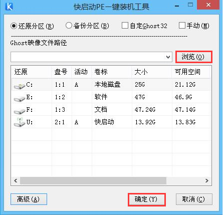 2、进入快启动win8pe系统后会自启快启动一键装机工具,在工具界面点击“浏览”按钮,如下图所示: