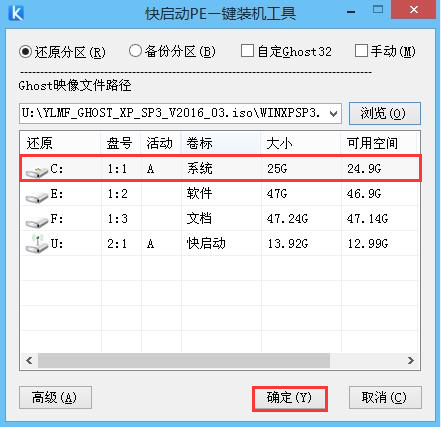3、选择事先存放在u盘启动盘中的ghost xp系统镜像文件,选择C盘为系统安装盘,接着点击“断定”,如下图所示: