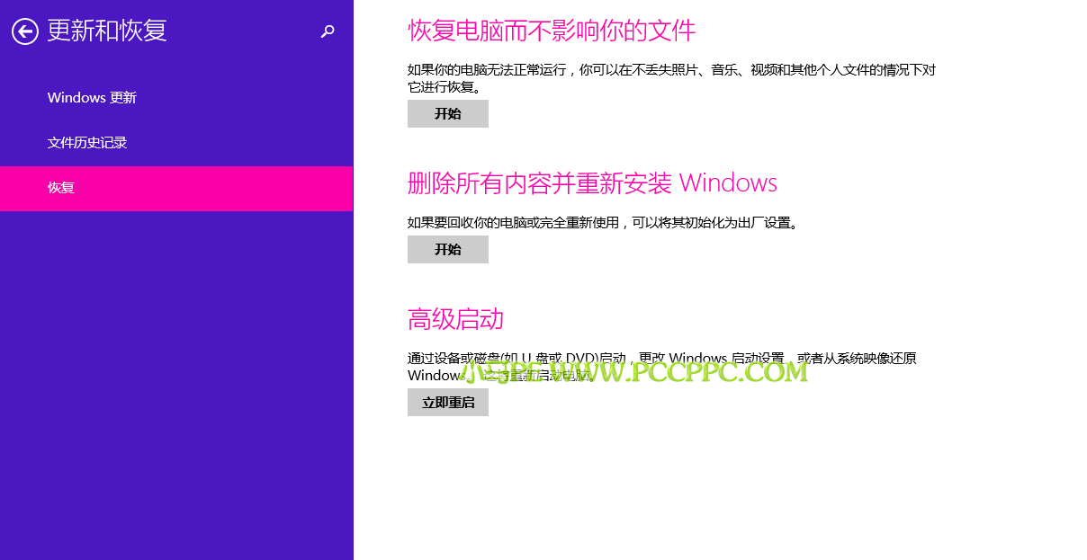3,我们先演示“恢复电脑而不影响你的文件”也就说系统盘所在分区的所有除微软操作系统自带的程序和驱动都会被删除,但是比如图片、音乐、视频、文档这样的文件会在本来的地位保存,但是个性化设置不会被更改。