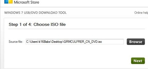 进入Windows7 USB/DVD 初始画面后,单击Browse,选择刚才下载的Windows 7镜像文件,之后单击Next。