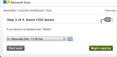这个画面是U盘已经被成功辨认,如果没有检测出来,点选设备下拉菜单选项后面的刷新图标可以进行刷新检测,一般状态下可以正常辨认出来,选择您需要制作为安装盘的U盘,点击右下角的Begin Copying,软件就开端制作了。