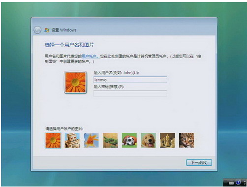 12、当涌现如下图所示的界面时,可以输入一个用户名(中文、英文都可以)作为系统的管理员帐户(这里举例输入为lenovo),还可以选择爱好的图片作为帐户图片。输入选择完成后点击"下一步"持续;