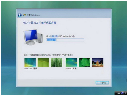 13、在此界面输入一个盘算机名,也可以应用默认的,并且可以选择一个自己爱好的桌面背景。选择完成后点击"下一步"按钮;