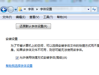 1、同上打开深度win7把持面板中的字体界面,然后点击“字体设置”,此时界面切换为字体设置窗口,拉下滚条,勾选“容许应用快捷方法安装字体”,选择断定,返回到字体界面。