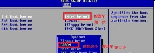 6把第一启动项的 1st Boot Device 的【Hard Deice】改成CDROM(有些是什么DVD);