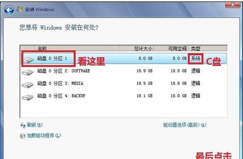 15这里选择第一个分区,类型为系统,再点击下一步(再这之前我们可以格式我们的第一个分区,在驱动器选项(高级)(A)那里);