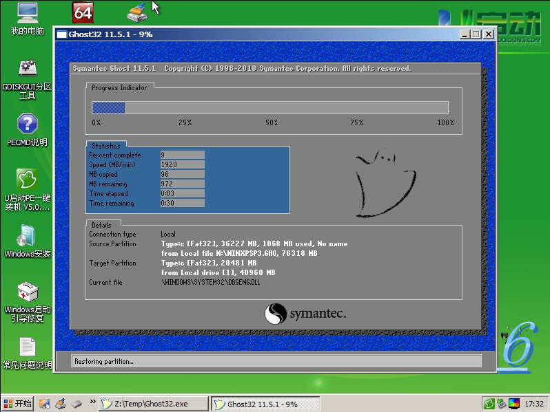 (3)完成上面的步骤后,会进入到u启动win2003pe系统,基础上到这边都会自行的运行“u启动pe一键装机”的,但是有时也会涌现没有自行运行的,不要着急,这种情况有时也会涌现,我们手动的进行操作,只要双击桌面上的“U启动PE一键装机” 就好了