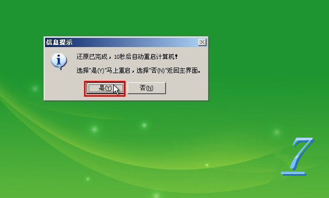 (7)上述步骤都完成后,上图所示的进度条完成后,会弹出一个提示框,问是否要重启电脑,我们只需要点击”是(y)“就好了。然后就会重启电脑,重启的时候我们要把u盘从电脑的usb接口上拔出,下面电脑会主动安装系统,直到进入电脑的桌面,之后就代表系统安装完成了