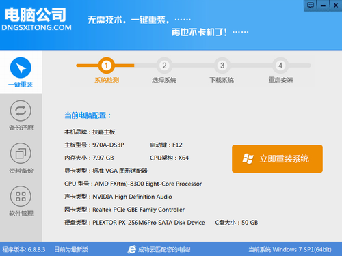 点击下载软件,并正常打开,点击软件首界面的“立刻重装系统”按钮进入检测页面,完成后点击“下一步”。