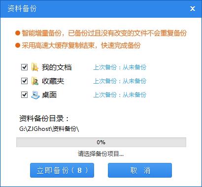 3.点击立即重装按钮后,会涌现材料备份界面,提示您是否对我的文档、收藏夹和桌面材料等重要材料备份。点击立即备份后,您就可以在下面的进度条中看到备份的进度和备份文件数量,待备份完成后主动进入下一步。如图三