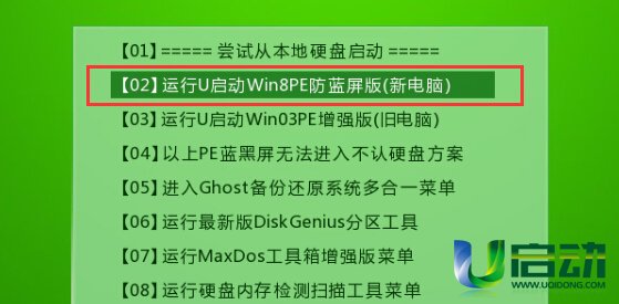 2、接着进入u启动主菜单界面,选择【02】运行u启动win8pe防蓝屏版,按回车键履行,如下图所示:
