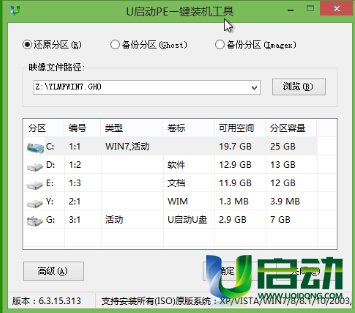 3、进入到u启动win8pe系统后,u启动pe装机工具会主动打开并加载。选择c盘,点击“断定”按钮履行,如下图所示: