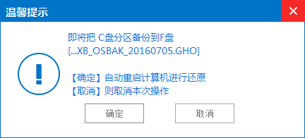 2、在弹出的提示框中确认系统盘区以及备份目标盘区无误后再次点击“断定”按钮,电脑将会进入重启状态并开端进行系统一键备份;