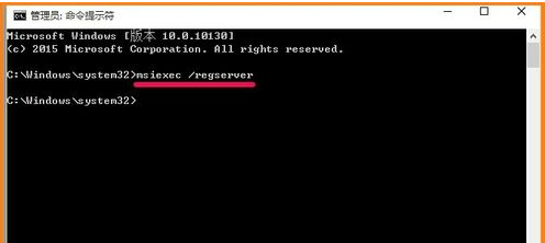 2、在打开的管理员命令提示符窗口,输入msiexec /regserver,回车,重新启动电脑。