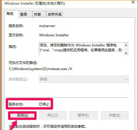 3、在打开的Windows Installer 属性对话框中,可见:Windows Installer的服务状态为:已结束,点击:启动;点击启动后,Windows Installer服务状态为:正在运行,点击:断定,退出本地服务。