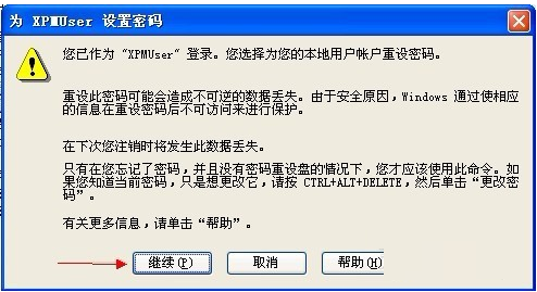 4、弹出了“重设此密码可能会造成不可逆的数据丧失”的提示框,点击“持续”