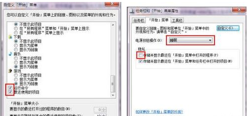 补充:比如我们在“自定义开端菜单”中勾选“运行命令”和“最近应用过多项目”(下左图),断定后在“任务栏和开端菜单属性”的“开端菜单”页卡中奖电源按钮操作设置为“睡眠”,取消勾选“存储并显示最近在开端菜单中打开的程序”(下右图),最后点击断定。