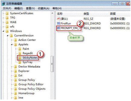4、 双击 PROMPT_ON_DELETE 注册表项。 在“值”数据框中,键入 00000001,单击“断定”。退出注册表,再去删除便签,提示框又会跳出来了。