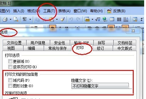 方法二:工具/选项,在“打印”项中取消“打印文档的附加信息”下的域代码和图形对象,同时设置“不打印暗藏文字”。最后断定即可。