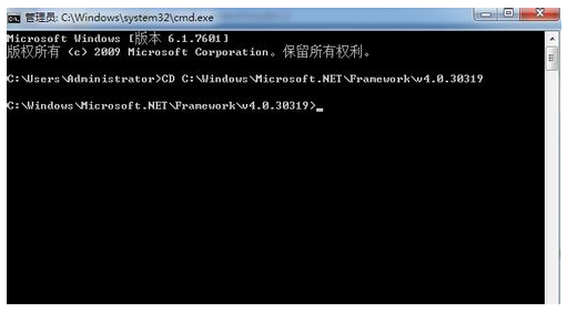 2、定位到.net4.0、.NET2.0的安装目录,在此界面输入CD C:\Windows\Microsoft.NET\Framework\v4.0.30319或v2.0.50727回车即可,2.0也要有同样的操作,只是路径不一样。
