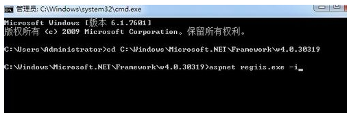 3、重新注册IIS,在此界面输入:aspnet_regiis.exe –i回车即可