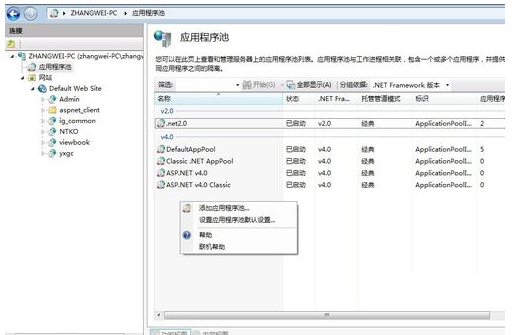 4、在IIS下的“利用程序池”中找到“你所建网站”对应的那个,双击打开,修正为2.0