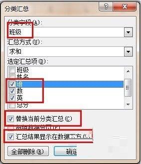 三,在分类汇总对话框选择相应的项:分类字段选择要分类汇总的列名,这里选择“班级”;选定汇总项勾选“语数英”三列。如图所示。