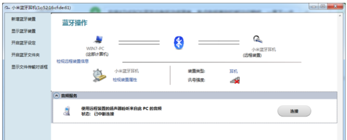 5、在蓝牙耳机设备的图标上右键,高级操作,打开连接窗口,点击连击,连接耳机安后就可以正常应用了。