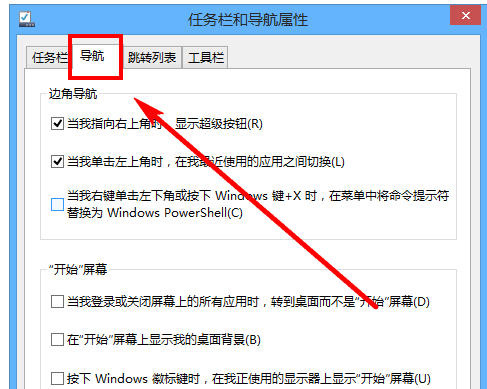 2、在打开的“任务栏和导航属性”对话框中,单击“导航”选项卡,如下图所示: