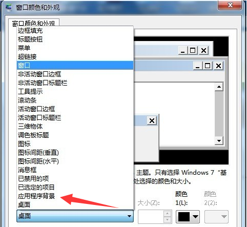 5、重点来了,如果还要更改特定项目标窗口色彩和外观(如更改将利用于任务栏和利用程序背景),请单击“高级外观设置”,打开窗口色彩和外观对话框,单击项目标箭头三角按钮,打开的下拉菜单选择想要更改的项目。