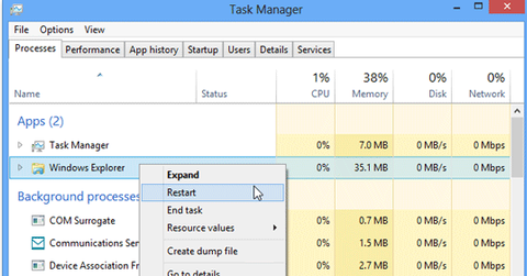 taskkill /f /im explorer.exe & start explorer.exe
