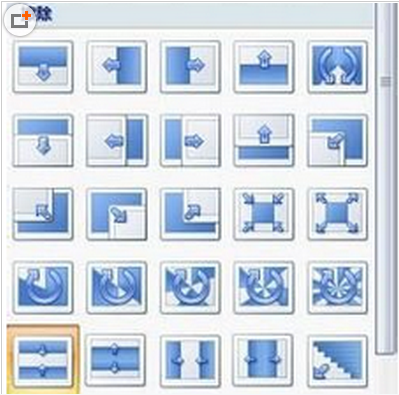 2、弹出许多种不同的切换作风,我们只需将鼠标放哪个效果上PowerPoint2007就能够主动的演示效果。