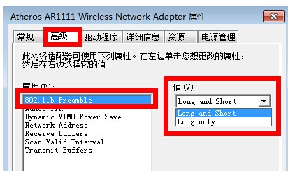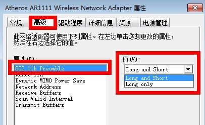 3、双击进入之后找到”高级“的选项(如下图)。找到”802.11“的选项,在右手边有一个“值“,(具体根据自己电脑来选择),我的电脑只有两个选择”Long only“或者”Long and Short“,我这里选的是”Long and Short“。