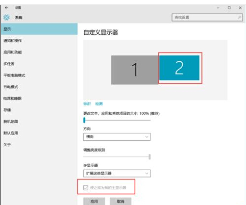6、将显示器2设置为主显示器,点击显示器2,勾选使之成为主显示器: