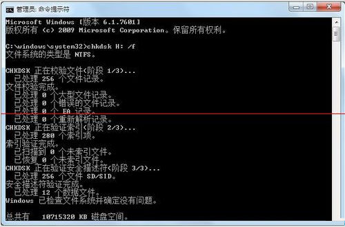 2、输入修复命令:chkdsk H: /f (H是问题硬盘的盘符)。涌现这个提示,是没有权限。