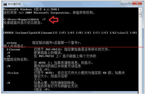 1、如果进不了操作系统,可以应用u盘PE系统进行修复。打开命令提示符窗口,键入查询磁盘检查的命令:chkdsk /?