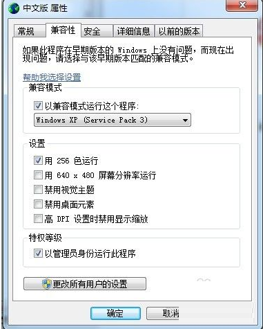 2、切换到兼容性标签页,勾选“以兼容模式运行这个程序”,选择:Windows XP(service Pack3),此处根据程序而定,在特权等级,勾选“以管理员身分运行此程序”,点击断定;